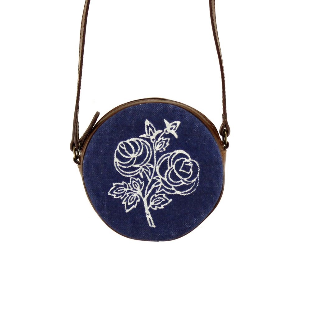 Dilians Blaudruck kleine runde Umhängetasche aus mittelbraunem Nappaleder, kombiniert mit handbedrucktem Original Blaudruck Stoff von der Blaudruckerei Folprecht aus Coswig, Sachsen