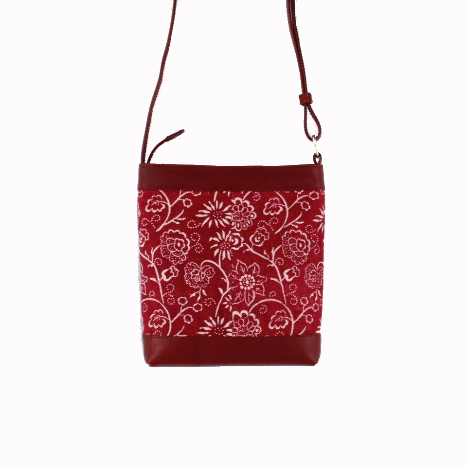 Diese unkomplizierte Umhängetasche eignet sich für die Tage, wo man (Frau) nicht zu viel und nicht zu wenig mitnehmen will. Mit ihrer sportlichen und sympathischen Form wird sie sicher zu einer interessanten Ergänzung des ganzen Outfits. Der wertvolle handbedruckte Leinenstoff, aus dem die Tasche produziert worden ist, wurde so handwerklich bearbeitet, das er fast so robust und strapazierfähig, wie das übrige dunkelrote Nappa Leder der Tasche, erscheint. Den stabilen Schulterriemen der Tasche kann man bequem auf jede gewünschte Länge einstellen. So ist es möglich, diese Tasche genauso bequem ganz unten an der Hüfte tragen, wie mit ganz gekürztem Riemen unter dem Oberarm. Die Tasche kann man mit einem robusten Reißverschluss zumachen, so wird der Inhalt der Tasche gut geschützt. Im beigefarbenen Futterstoff aus Polyester befindet sich ein größeres Handyfach. Falls die Tasche mal nicht zum Einsatz kommen sollte, kann man sie im mitgelieferten Stoffbeutel aus Baumwolle staubgeschützt aufbewahren.