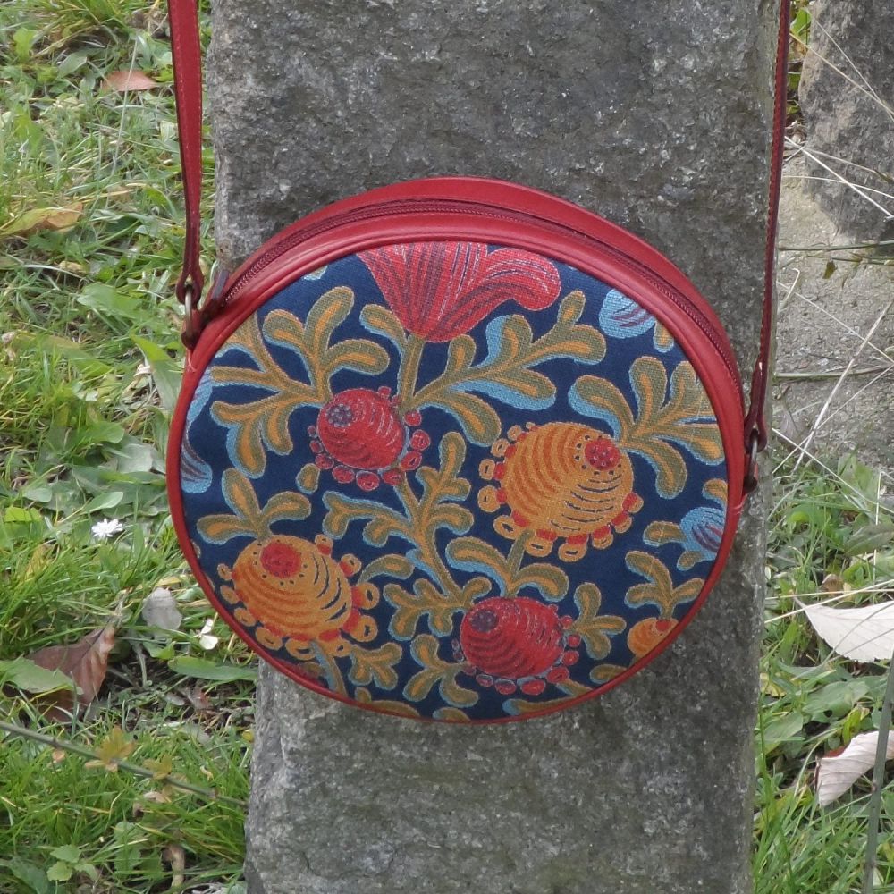 Eine runde Sache – die neueste mittelgroße Dilians Schultertasche. Eigentlich ist ihre interessante, einfache Form nichts neues. Man sieht dieses Modell in verschiedenen Varianten immer wieder auch bei den berühmten Designermarken. Die Dilians Variante hat aber den Vorteil, dass sie ganz originell daherkommt – eben mit handbedrucktem Stoff aus der Heimat. Dieser wurde so handwerklich bearbeitet, das er fast so robust und strapazierfähig, wie das übrige Nappa Leder der Tasche, erscheint. Die Größe der Tasche ist ausreichend für die wichtigsten Utensilien, die man (Frau) mitnehmen muss. Da sie aber nicht allzu groß ist, findet man da drin alles viel schneller. Dieses Taschenmodell hat zwei Seiten (eine dunkelrote Lederseite und eine Stoffseite), so dass man praktisch jedes mal zwei Tragemöglichkeiten hat. Falls das wunderschöne Muster mal zum übrigen Outfit nicht passen sollte, kann man ihn am Körper tragen und zur Abwechslung mit der einfarbigen Seite den eigenen Stil betonen. Außerdem ist diese Tasche auch immer ein hübscher „Eyecatcher“ zu einem einfarbigen Outfit (wie z.B. zu einem Trenchcoat, oder Parka). Im Polyester Innenfutter der Tasche in hellbeige gibt es ein Handy Fach und eine Seitentasche mit Reißverschluss. Der Trageriemen ist selbstverständlich verstellbar, so, dass jede Kundin die für sie optimale Länge einstellen kann. Im mitgelieferten, praktischen Stoffbeutel aus Baumwolle kann man die Tasche daheim Staub geschützt aufbewahren.